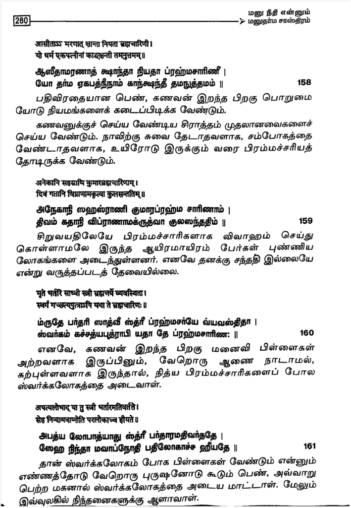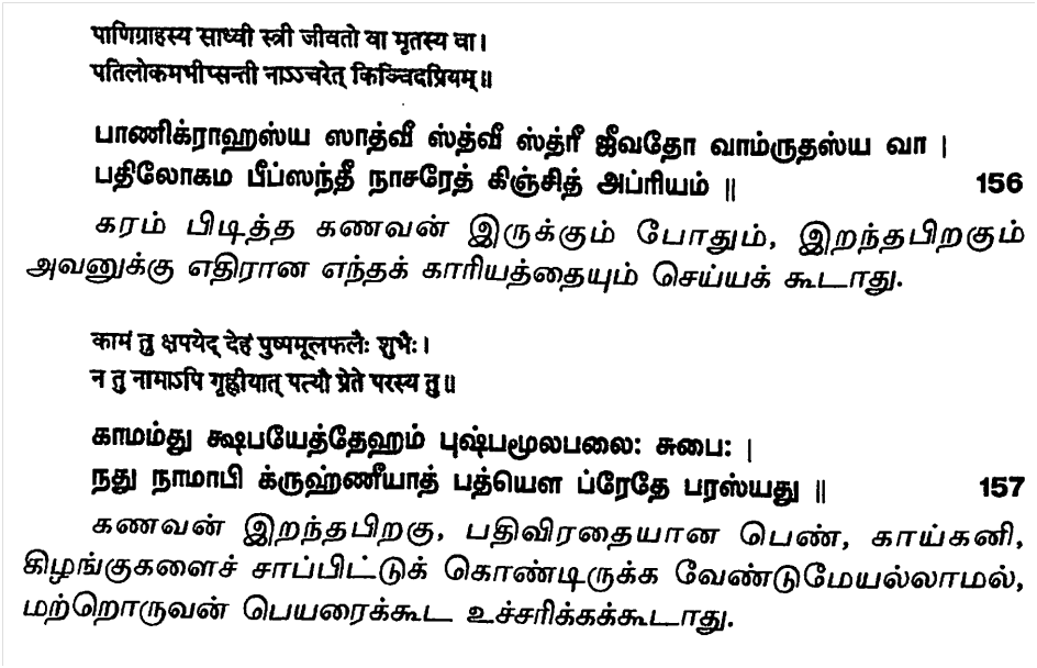 கைம்பெண்களுக்கு இந்தியச் சமூகம் விதித்த கொடுமையான விதிமுறைகள் யாவற்றுக்கும் அடிப்படையாக அமைந்திருப்பது, மனுதர்மம் என்ற மனு சாஸ்திர நூலின் சில சமஸ்கிருதப் பாடல்களே. அந்த சமஸ்கிருதப் பாடல்களின் புகைப்படங்களை கீழே தருகிறேன்.